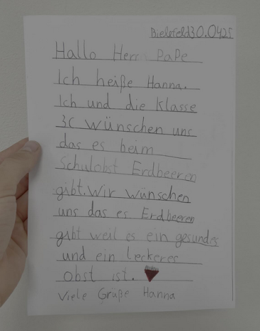 Hanna aus der 3c hatte sich im Klassenrat gewünscht, dass es bei unserem wöchentlich gelieferten Schulobst Erdbeeren gibt. Nach einem entsprechenden Brief an Herrn Pape wurde Kontakt zum Gut