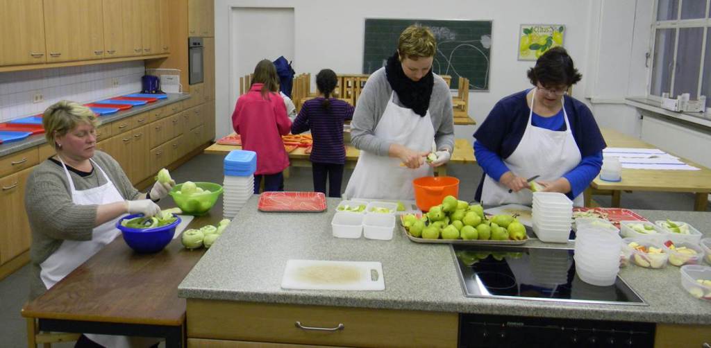 Um 8 Uhr an den Schulobsttagen treffen sich dann engagierte Eltern und vier Schüler:innen in der Schulküche, um das Obst und Gemüse in fast mundgerechte Stücke zu portionieren. Es kommt dann in verschlossene Dosen, die auf ein Tablett für jede Klasse kommen.